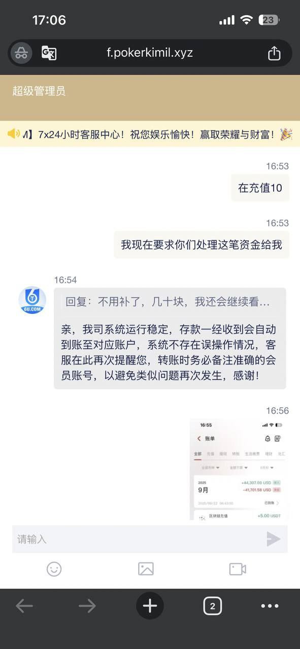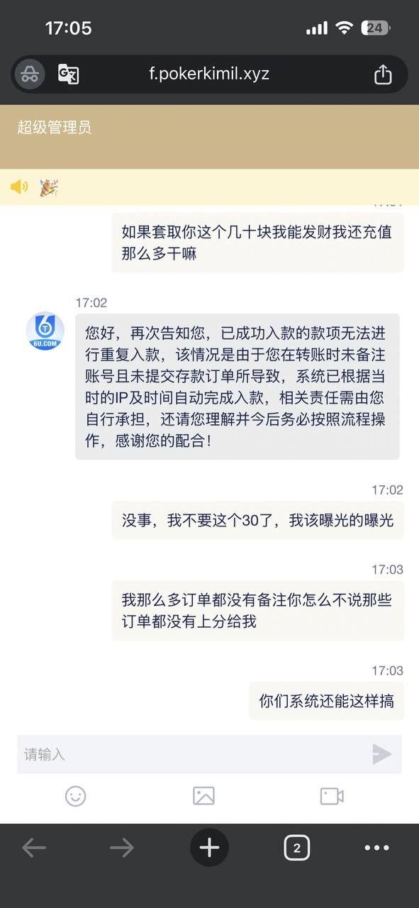 打着官方正版游戏,在欺骗客户,联系客服处理,客服一直不回复,然后去修改掉我的注单,说什么游戏规则让我去看一下,爆粉600分你给我加200分这个合理吗,平台没有担当遇到问题全部推给用户,反正你管死活,我是平台我最大,你的反馈我就当做看不见,这个黑平台黑过黑八,相信很多人都有遇到中中的分数加不够,总之希望大家看好了,不要让他当猪仔杀了,这个平台客户很牛逼,有什么问题马上去修正,就说你的注单不对马上给你你改对去,反馈了十几天让他们的人联系我,好把视频给他们,你问什么都是嗯,好的会给你提交上级部门,你一个给黑台子,有逼脸说吗,充值没有备注id上去,忘记下单,事后说你这边恶意套取资金,自己充值的钱,只要有ip的系统自动上到别人的账户去,这就是6u最大的特点,不需要充值你的账户,反正只要是账户就行,损失你自己承担