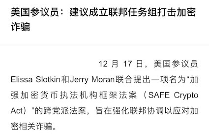 12 月 17 日,美国参议员Elissa Slotkin和Jerry Moran联合提出一项名为“加强加密货币执法机构框架法案(SAFE Crypto Act)”的跨党派法案,旨在强化联邦协调以应对加密相关诈骗。