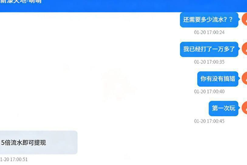 玩家申请提现时客服变脸,强行要求完成5倍流水。玩家在被迫刷流水过程中导致资金大量损耗,最终被平台设下的规则陷阱榨干本金。