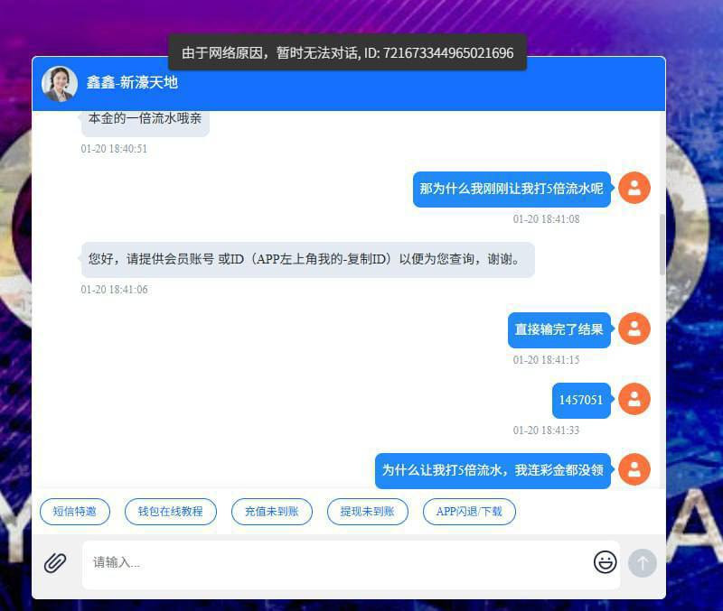 玩家更换账号咨询时,客服谎称仅需1倍流水即可提。待玩家亮出原账号ID质问,客服瞬间识破并实施封禁IP操作,彻底切断所有维权渠道。